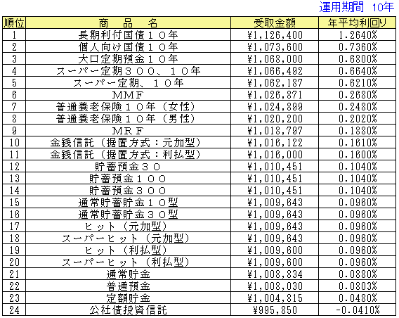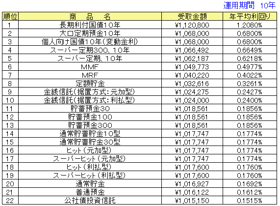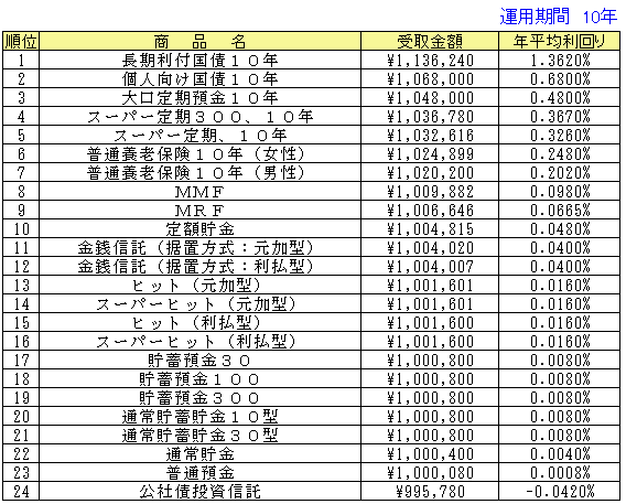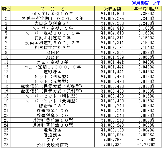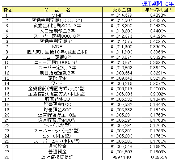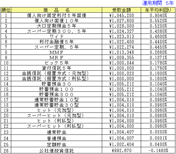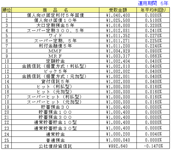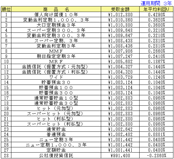 ○受取金額はそれぞれの期間で引き出した場合の実際の手取金額(税引き後)となっています。従って、その商品の満期よりも短い期間で登場している場合は中途解約した際の受取金額となります。手数料などが必要なものについては、差し引いて計算した金額になっています。